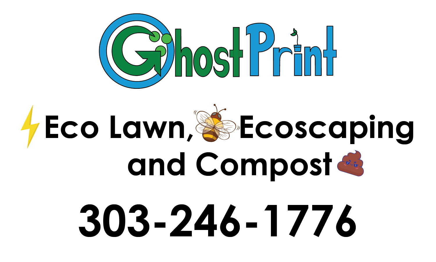 Business card for GhostPrint with logo, text, and emojis promoting eco-friendly lawn, escapsing, composting services, and phone number